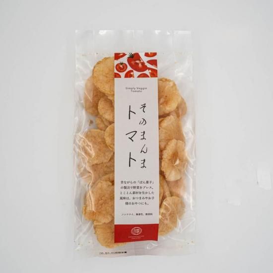 昔ながらのポン菓子技法を、プレス処理で進化させた「ベジまんま とまと」は、馬鈴薯澱粉をベースに、素材が膨化する限界までトマトを練り込んだ野菜ぽんせんべいです。化学着色料・香料・保存料を使わず、無添加で仕上げており、幼児から高齢の方まで安心して楽しめます。ふんわり軽く、トマトの自然な風味とほのかな甘みが広がる、一袋で手軽に野菜を感じるおやつです。